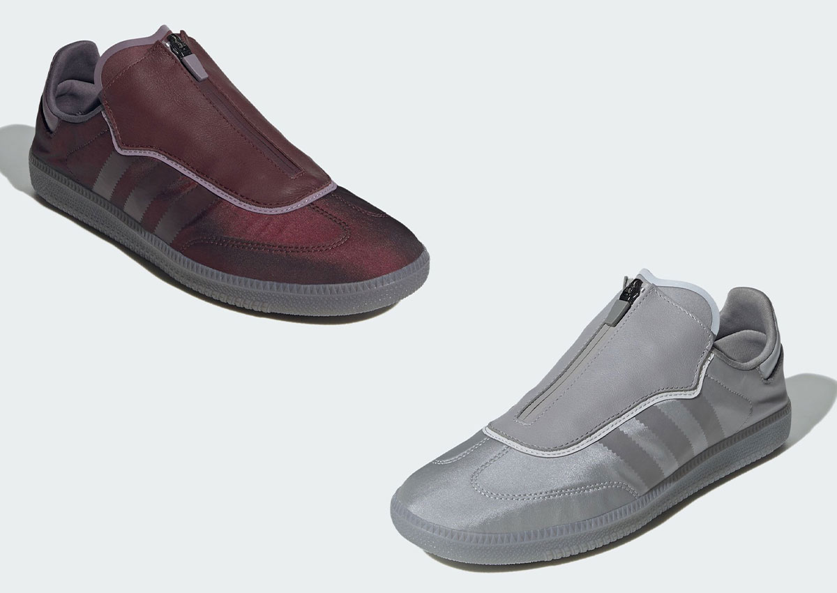 The two colorways both pay homage to the Samba’s classic indoor-soccer heritage but replace the traditional lacing system with a futuristic zip-up shroud for a sleek, minimal look. The Grey pair presents a mix of soft leather overlays and matte nylon underlays, while subtle Three Stripes branding brings tonal contrast.