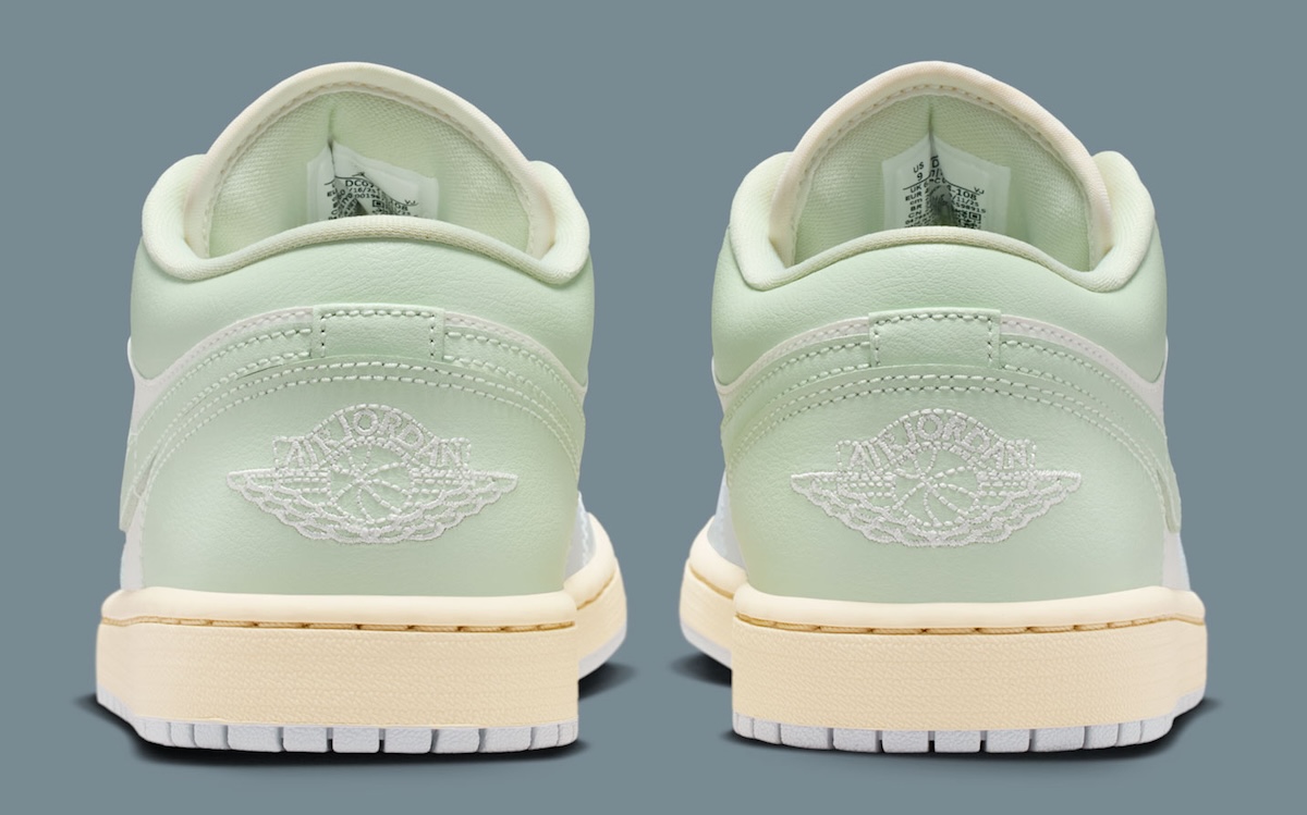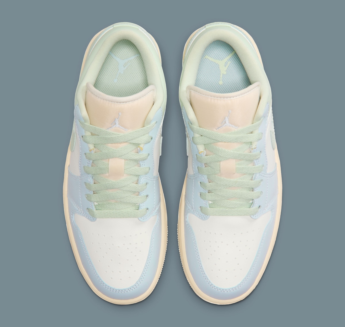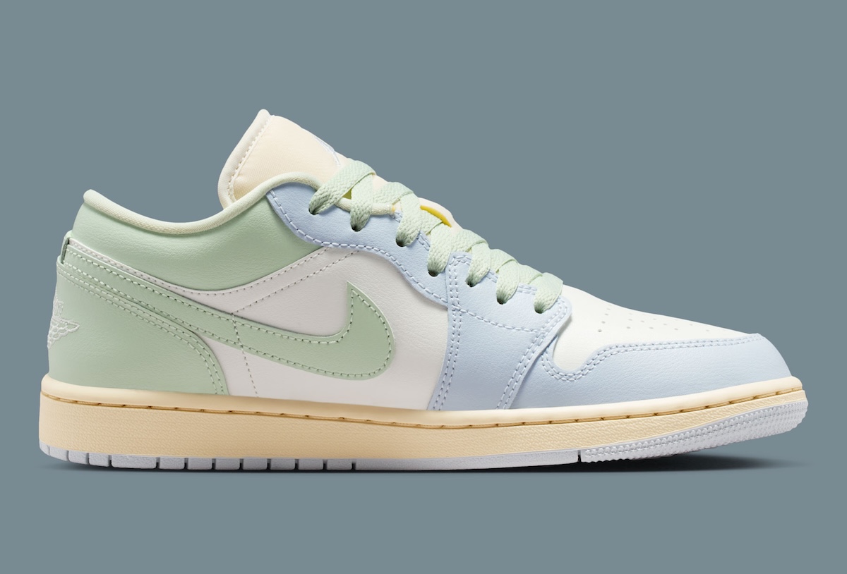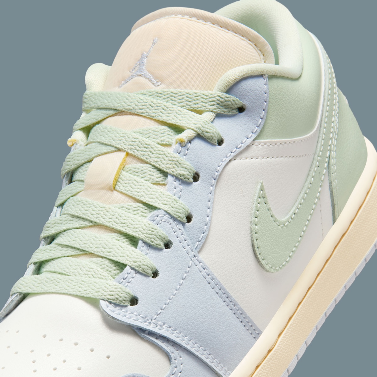 Pastel shades feel right at home on this pair, with white leather setting the base while light blue panels and Jade Aura hits ease in fresh spring energy. The cream-washed midsole adds quiet warmth instead of chasing the heavy “aged” trend seen on past drops. A clean white toebox grounds everything in familiar AJ1 Low style, and the two-tone laces tie the palette together nicely.