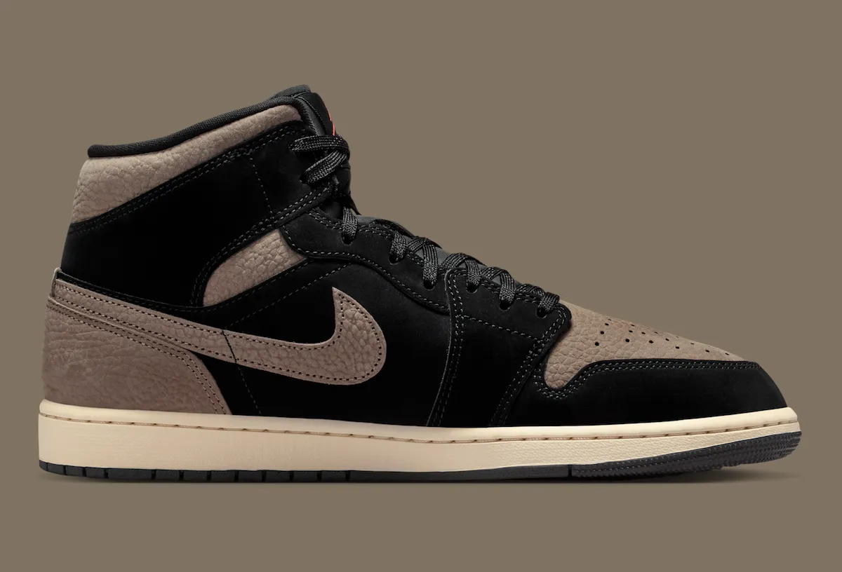 The Air Jordan 1 Mid “Black/Olive Grey” will release in early 2026 at Jordan Brand retail stores and Nike.com.