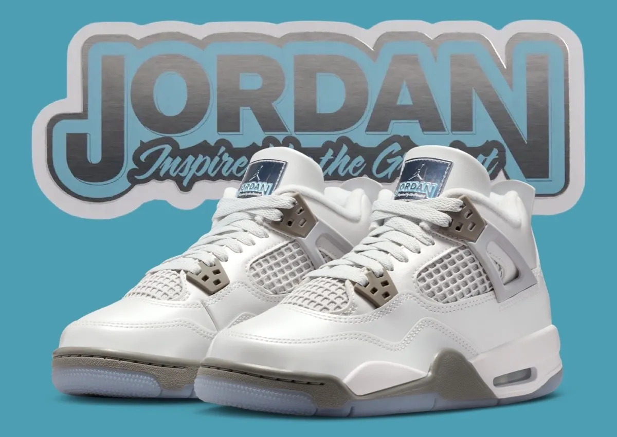 Jordan Brand is expanding its kids-exclusive “Inspired By The Greatest” collection with the Air Jordan 4 GS “Photon Dust/Blue Chill”. The series, centered around icy tones and motivational details, already includes a reflective Air Jordan 1 Mid.