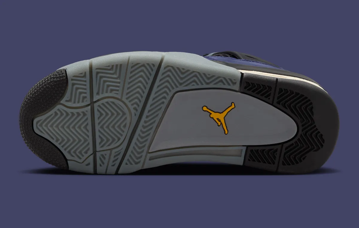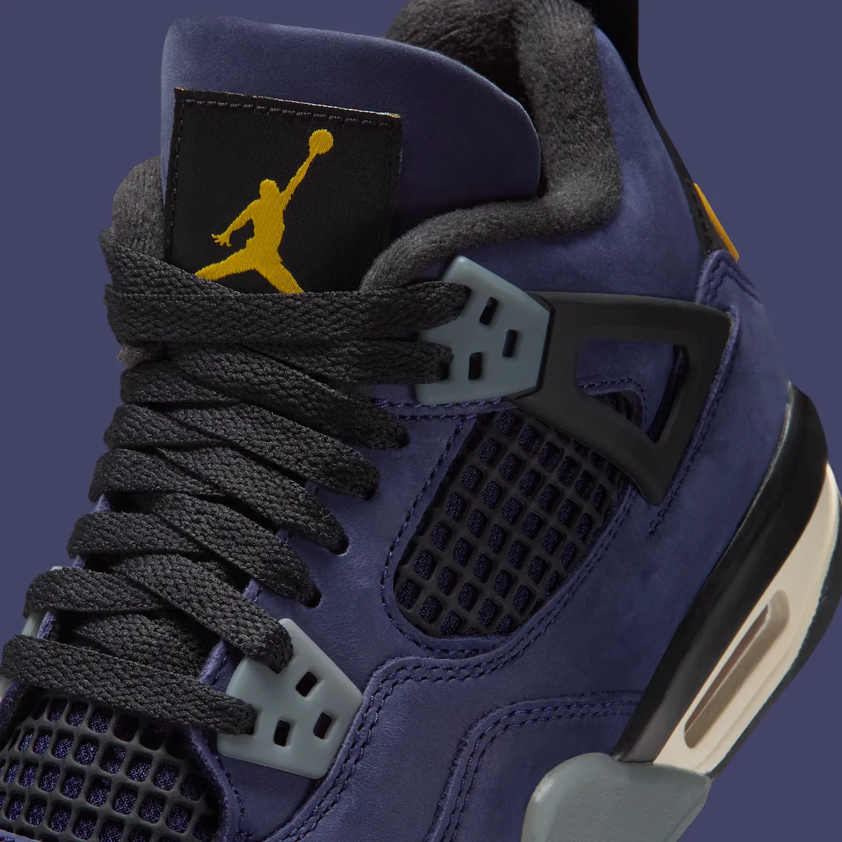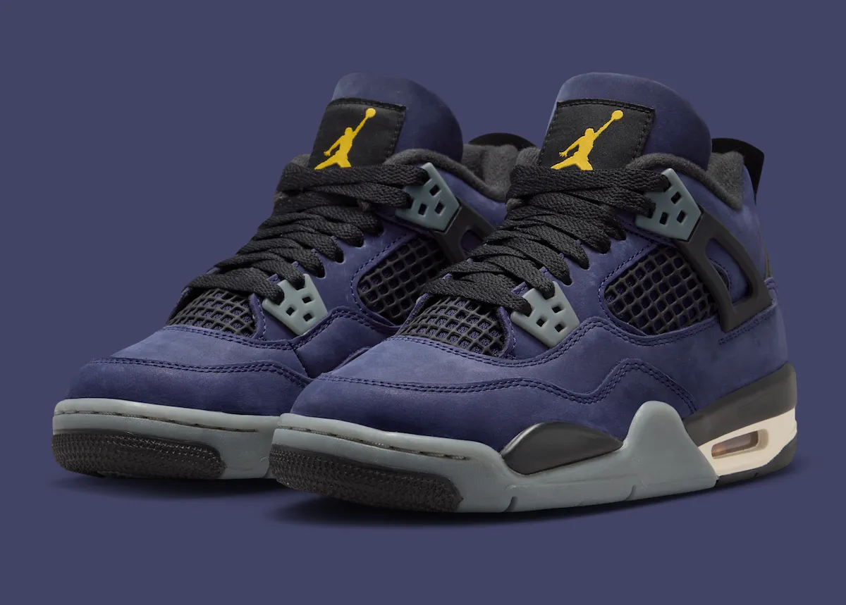 This pair leans into a rich Imperial Purple upper instead of the usual bright team shade, giving the shoe a deeper look that feels closer to indigo. Yellow details pop through the Jumpman logos, the speckled Nike Air heel branding, and the insoles. Black and grey accents balance the palette, while the familiar Jordan 4 framework—mesh netting, wing tabs, and visible Air—grounds everything in heritage design. The return of the Michael Jordan face box adds a nostalgic touch that longtime fans will spot immediately.