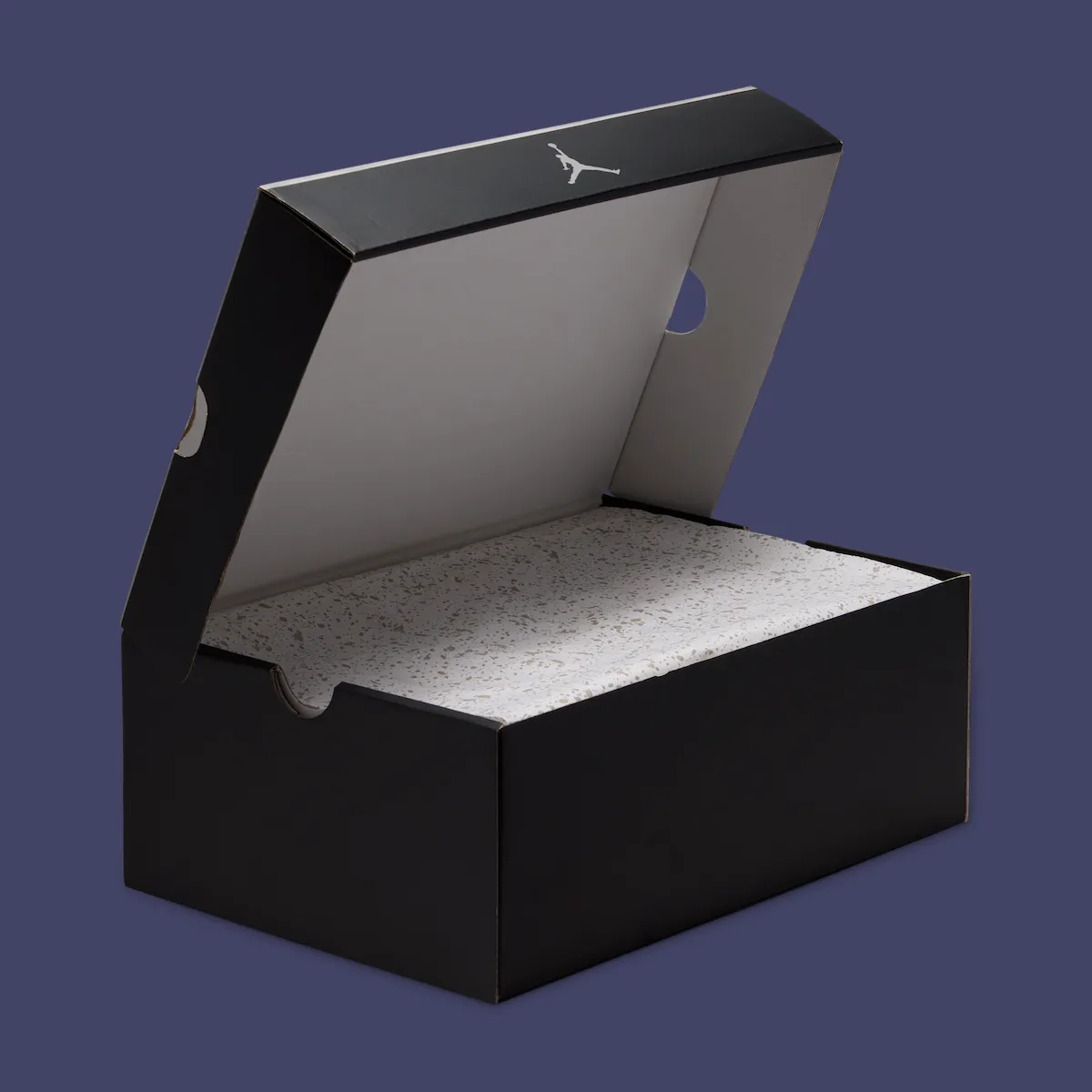 Although labeled a Lakers colorway, the darker shade leans closer to indigo. That twist gives the shoe crossover appeal, and some collectors may even read a Michigan vibe at first glance. The “WE OUTSIDE” hangtag continues Jordan Brand’s push for playful extras without distracting from the upper’s strong presentation.