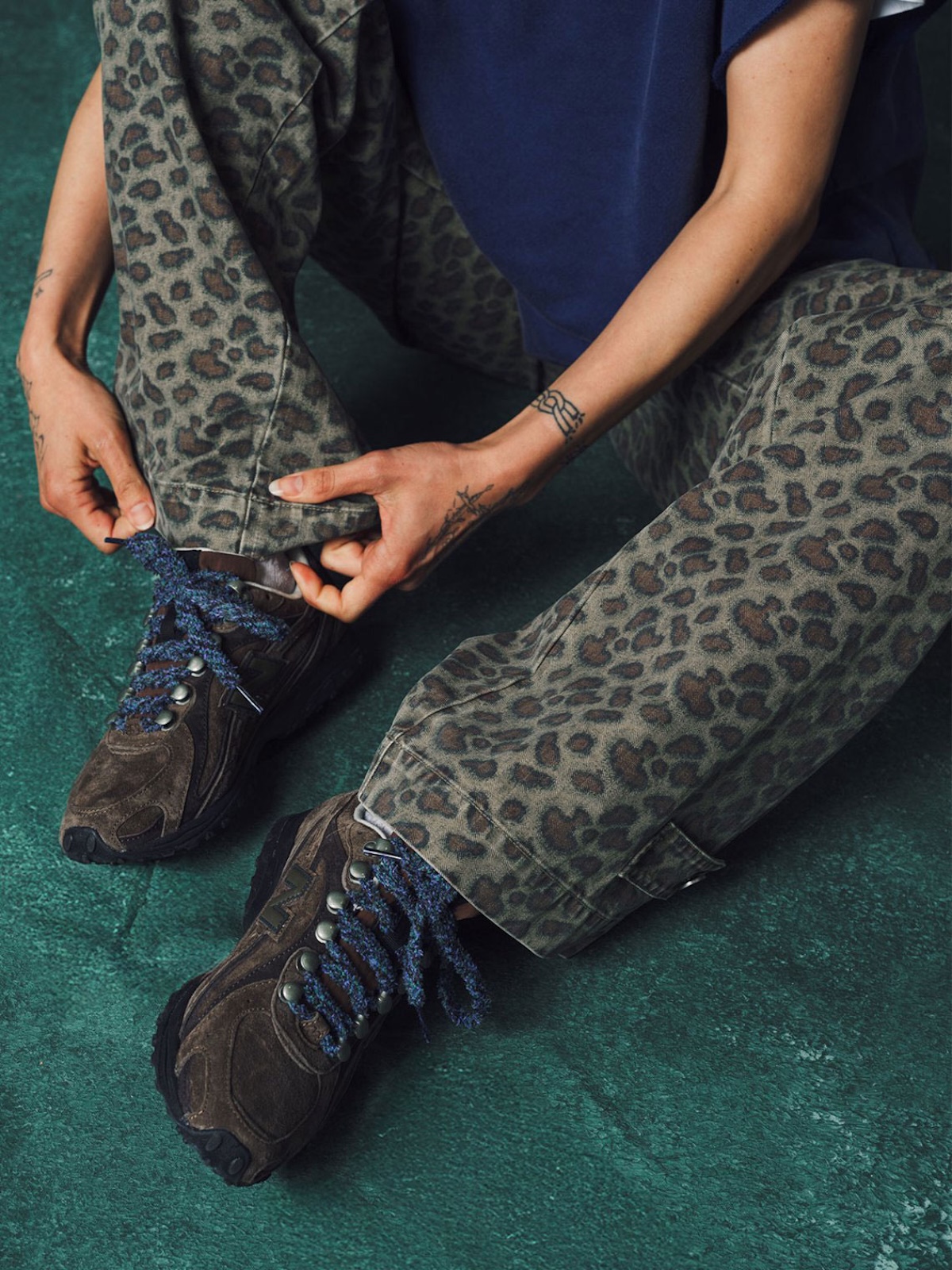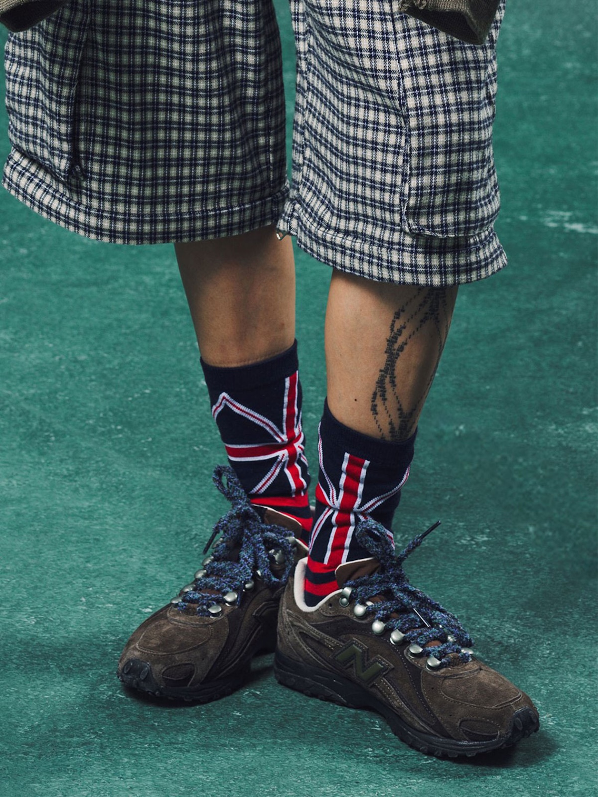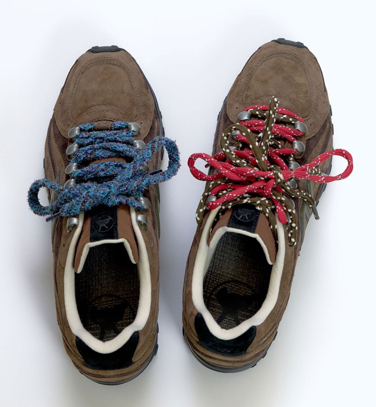 This pair leans into workwear energy and real-world mileage. Metal hardware stays put, joined by fuzzy red and blue laces, now sitting on a rich brown upper. Inside, leather lining and flannel insoles quietly push the grunge angle without turning the shoe into a costume.