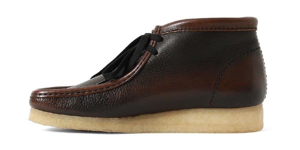 The collaborative model arrives with brush-off leather uppers in a stunning two-tone “Dark Tan Combi” colorway. Branding is minimal and subtle; matching brown insoles are stamped with the Clarks Originals logo, while the triangular lace hangtag features a debossed “WALLABEES” insignia. The boot rests on the silhouette’s iconic crepe sole with black laces for a lux finish.