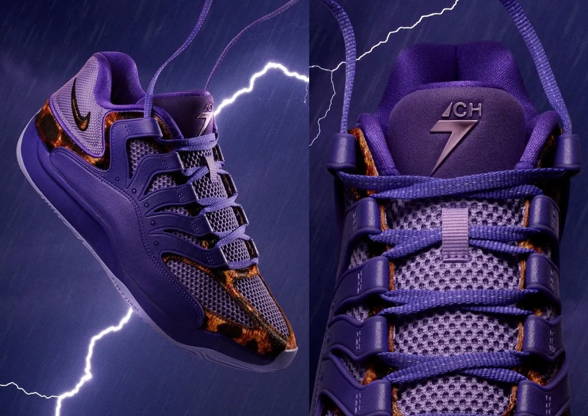 The KD 18 uses a deep purple colorway accented by animal-print overlays, producing a wild but luxurious aesthetic. The shoe features a mesh upper for a lightweight feel, sculpted overlays for added toughness and a Zoom Air midsole for responsive cushioning, keeping with the bouncing tradition of the KD line. The insole boasts Holmgren’s signature “CH7” logo while a black glossy Swoosh can be seen at the heel, both subtle and delicious details that make the shoe an ultra-rare and sure-to-be-exclusive release.