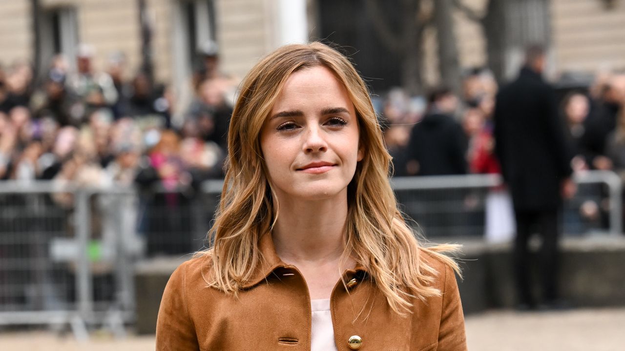 Emma Watson made a rare fashion week appearance at the Miu Miu spring 2026 show in Paris today–wearing one of her go-to items of the moment: a minidress. The actor opted for a pale pink shift from the Italian brand, which she teamed with a brown suede jacket, slingback kitten heels, and a black Arcadie bag.