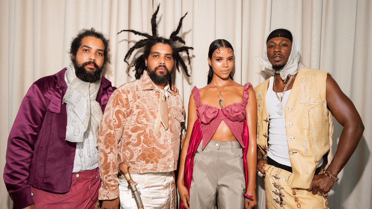 Following a live selection by harpist Cassie Watson Francillon, models emerged in cotton separates printed with colorful fish; billowy khaki pieces accessorized with octopus-shaped bibs; and plaid looks marked by deconstructed silhouettes. Ruffled collars, tentacle-like carwash hems, and sailor pants further evoked the maritime theme, as did fin-shaped details which flapped on the backs of shirts and along pant seams. Many of the fabrics, Dynasty said, were sourced during a trip to Dominica in 2022, where their maternal grandfather was a fisherman and their late mother was born. “We used actual copper to create different types of fabric [because] copper has healing value and properties.” Linen, known for its naturally high vibration, was also used throughout.