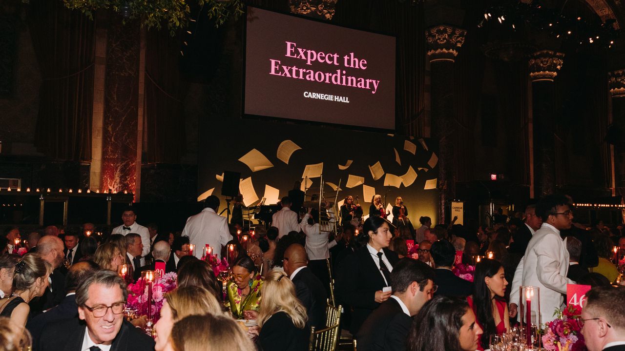 The evening’s festivities began with a lavish cocktail reception in the Rohatyn Room, the banquet space that is adorned with oversized posters of noteworthy concerts—Judy Garland and Isaac Stern among them—that have taken place at Carnegie Hall. Guests in tuxedos and ball gowns rendezvoused in the intimate space and swarmed the buffet tables and sushi stations as chefs turned out endless pieces of sashimi and salmon-avocado rolls. With a plate of food in one hand and the gala’s signature drink—a bright-pink retro cosmo of vodka, elderflower, and Prosecco—in the other, the stylish crowd socialized until an usher moved through striking a xylophone with a mallet to signal that the show was about to start.
