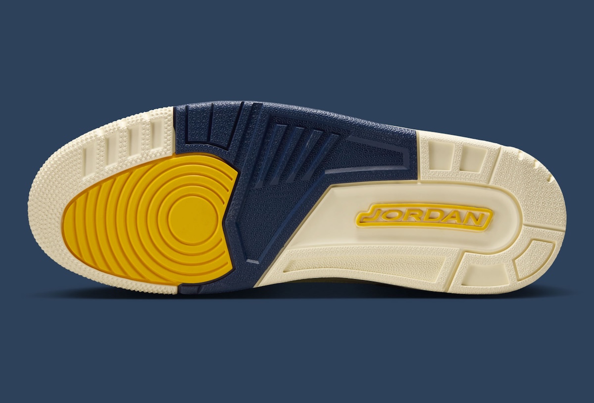 The colorway pulls directly from Michigan’s iconic maize and blue, a palette long tied to Jumpman’s NCAA legacy. Sail leather covers most of the upper, creating balance and letting darker navy accents carry the structure. Those deeper tones land on the heel, wing eyelets, and midsole sections.