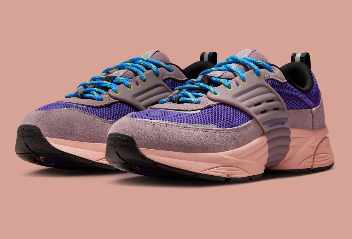 The silhouette’s upper is a tough mesh and suede patchwork decked out in muted purples, highlighted by electric blue laces and stringing. A molded midfoot strap keeps things secure, a common Trunner feature. A sturdy chunky foam midsole in soft pink hues provides further support and nostalgia. Jumpman branding, along with pops of yellow in the heel, help to finish the style.