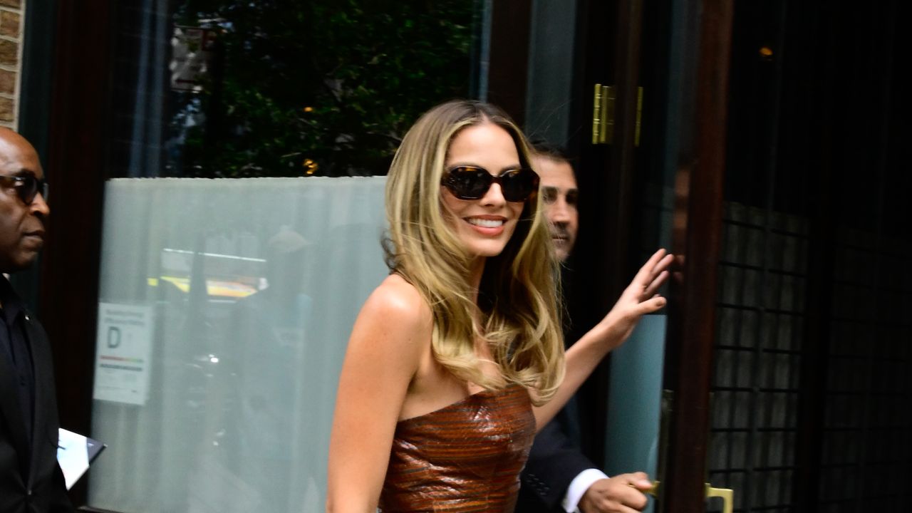 Photographed yesterday (September 16) while out and about in New York City, Robbie wore a strapless, earthy brown reptile-effect corset top with a matching suede midi skirt with a coordinating thick waist band by fellow Aussie, designer Christopher Esber. She styled it with square tortoiseshell sunglasses and and some barely-there brown sandals by Khaite with delicate criss-cross straps.