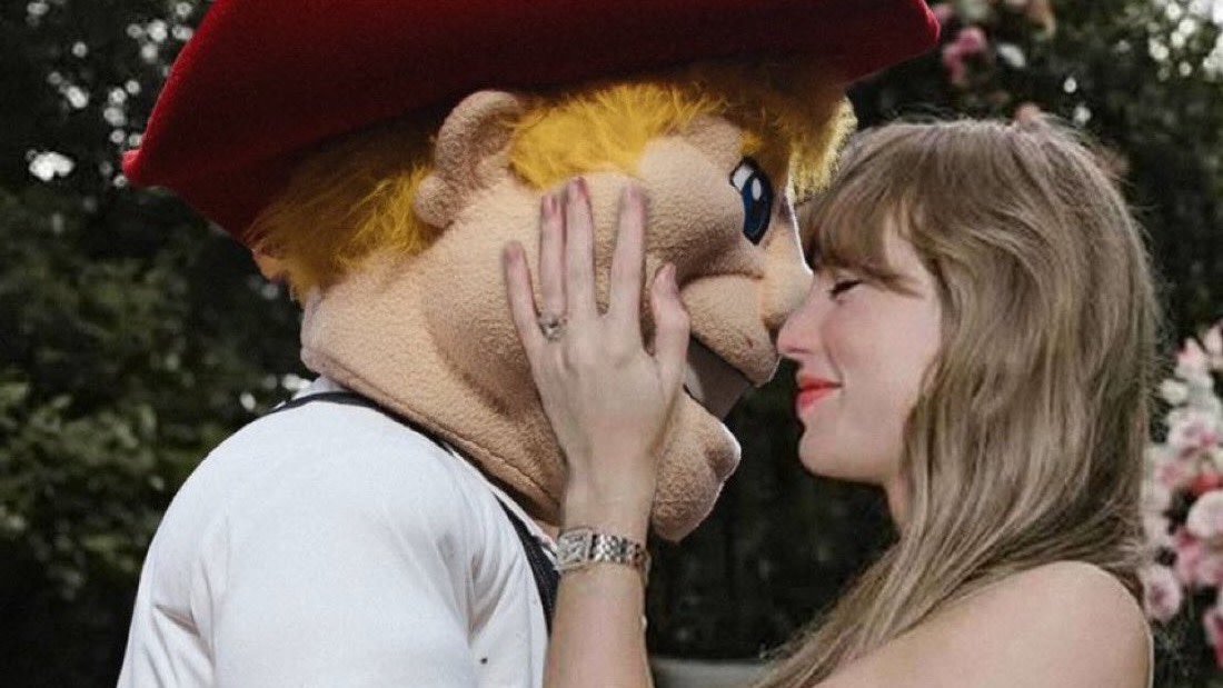 According to BroBible, the University of Nebraska’s social media team photoshopped one of Swift and Travis Kelce’s engagement photos (which you can see below), swapping out the singer’s NFL fiancé with the Huskers mascot, Herbie Husker.