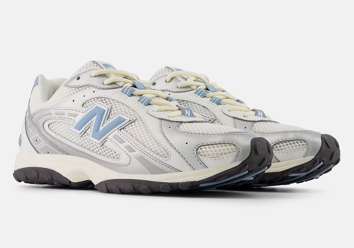 A mesh base keeps things breathable, while silver overlays add stability. Ice Blue pops on the distinctive “N” logo, heel tab, lace loops, and outsole for a hint of contrast that’s immediately eye-catching to sneakerheads familiar with New Balance’s Y2K classics.