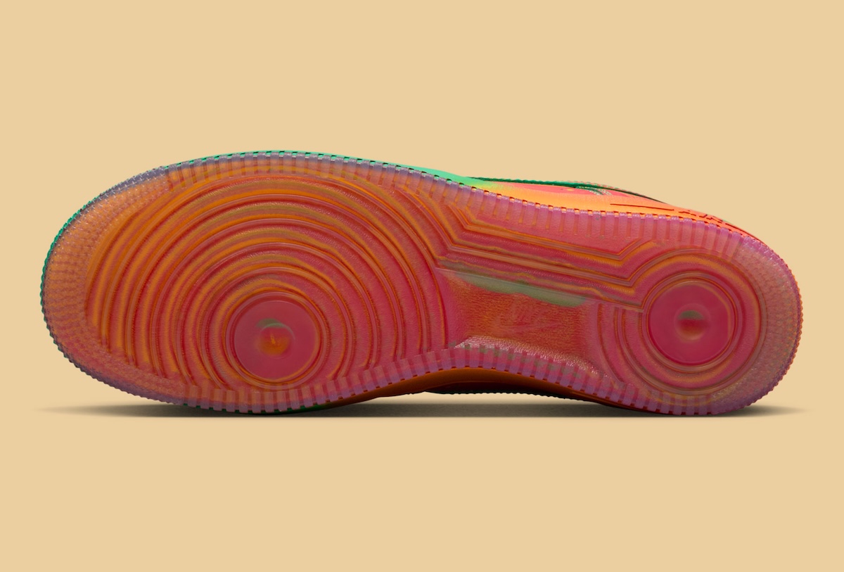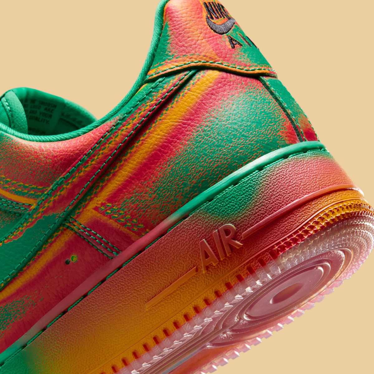 The base stays true to the classic leather Air Force 1 look, but the color treatment gives the shoe a spark you notice right away. Green holds the front, then the heel slides into hot red and yellow, almost like someone brushed heat across the back and let it settle there.