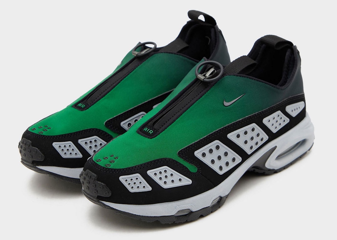 The sleek neoprene upper is fade from Pine Green to Black and features Wolf Grey overlays with perforated details. A zipper closure keeps the look sleek and streamlined, which was a departure from traditional runners when it debuted. That’s the kind of nostalgic detail sneakerheads will appreciate immediately.