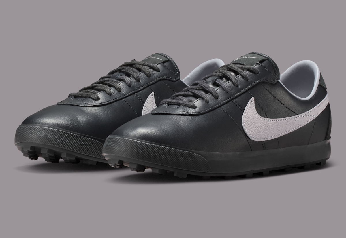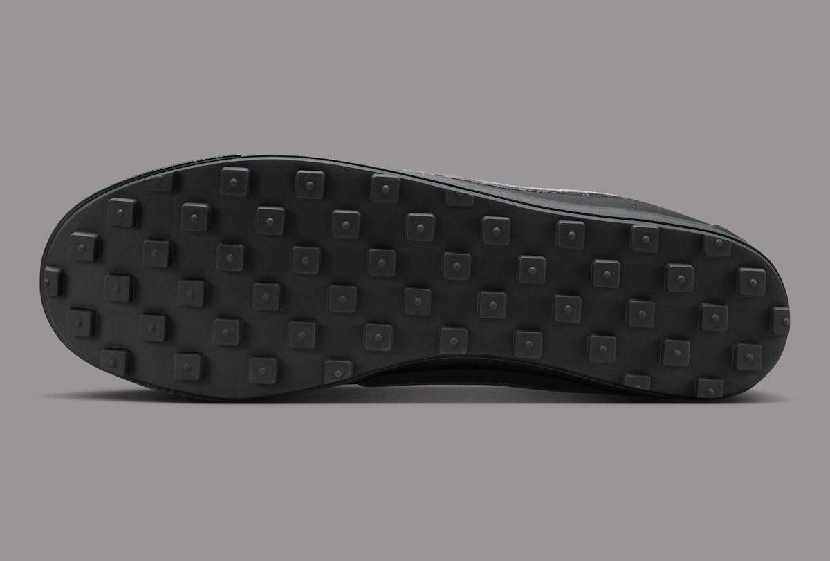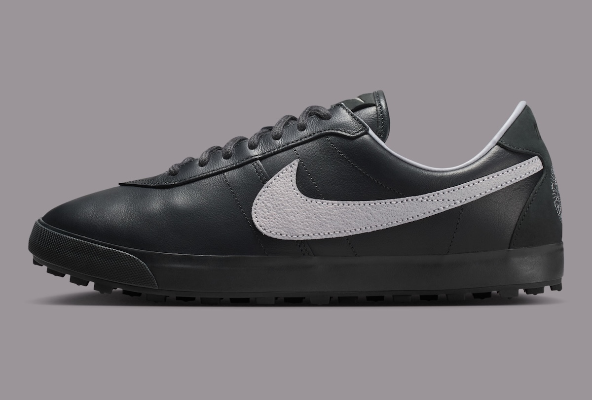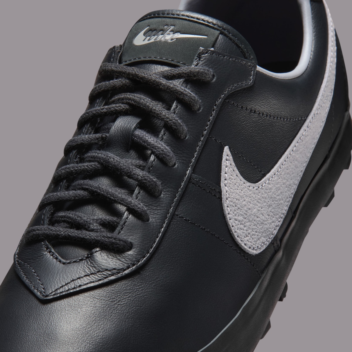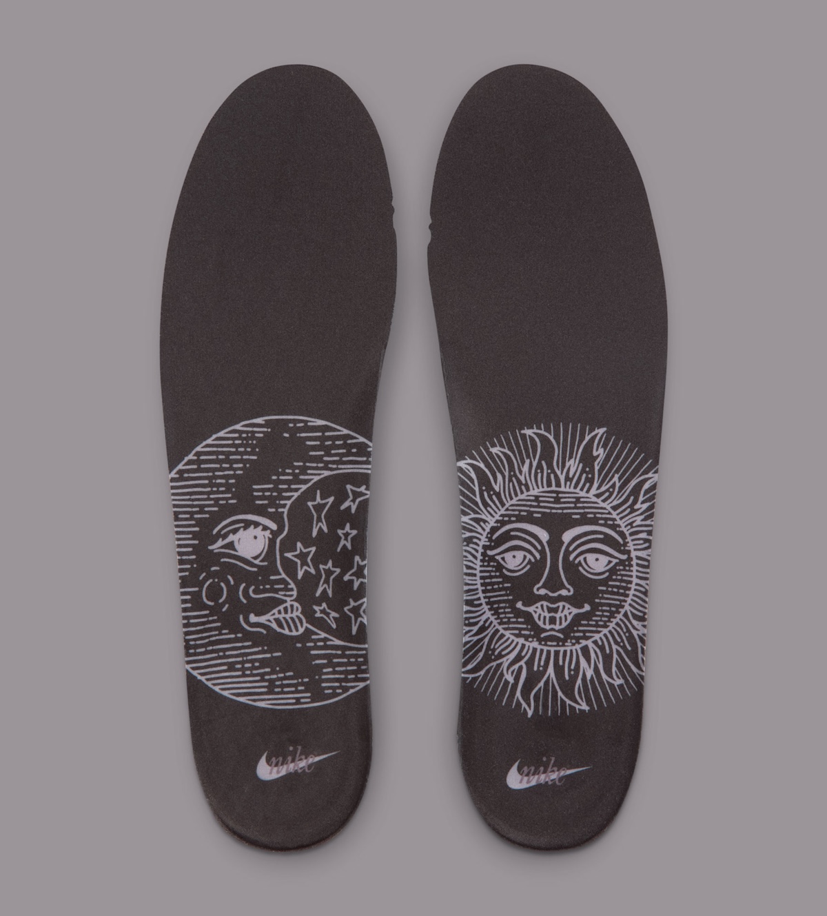 Smooth black leather builds the foundation, with a flat grey suede Swoosh offering a non-black interruption. Embroidered sun and moon graphics land on the heels, bringing character to the silhouette while staying tastefully restrained. The same graphics appear embroidered on the insoles, continuing a day-and-night theme that surprisingly feels organic in this instance.