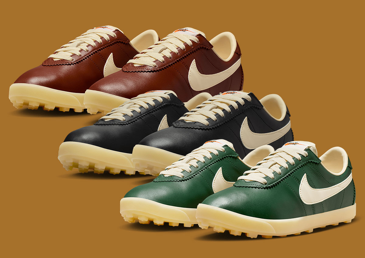 Muslin accents can be found on the Swoosh, lining, and sole of each colorway in the pack, providing an off-white, retro-inspired canvas. Bold, leather uppers in Black, Red and Green differentiate each sneaker.