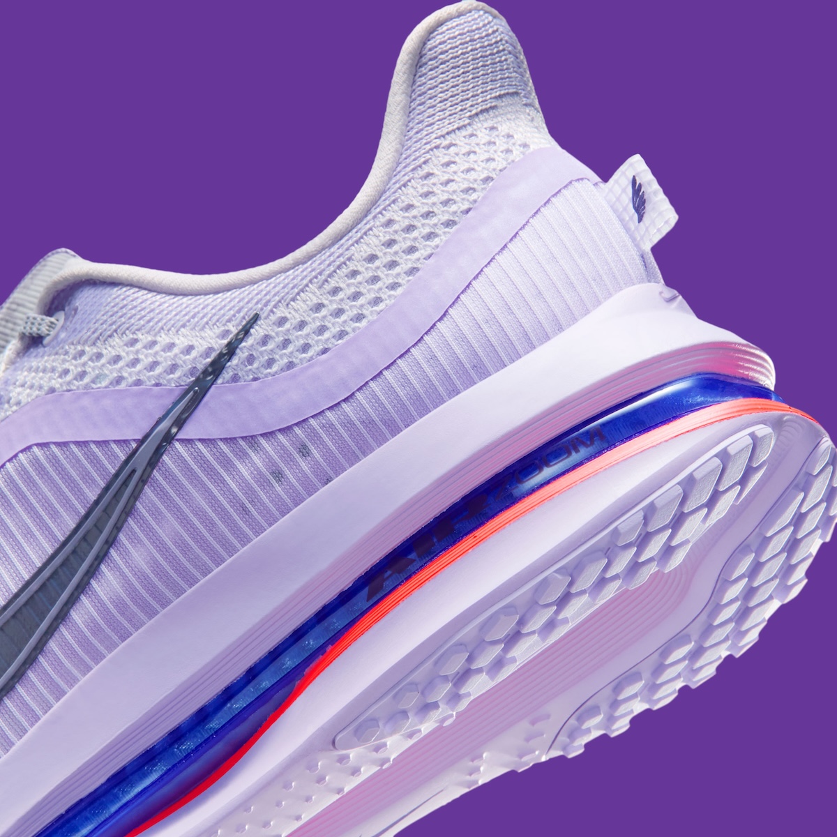 Nike mixes mesh, ribbed textiles, and translucent panels, giving the upper a depth you really notice in hand. The navy Swoosh adds just enough contrast to break up the purple haze without stealing the spotlight. It’s a cleaner approach than some of the louder Pegasus palettes we’ve seen in recent years, which might be why this one instantly reads as wearable.