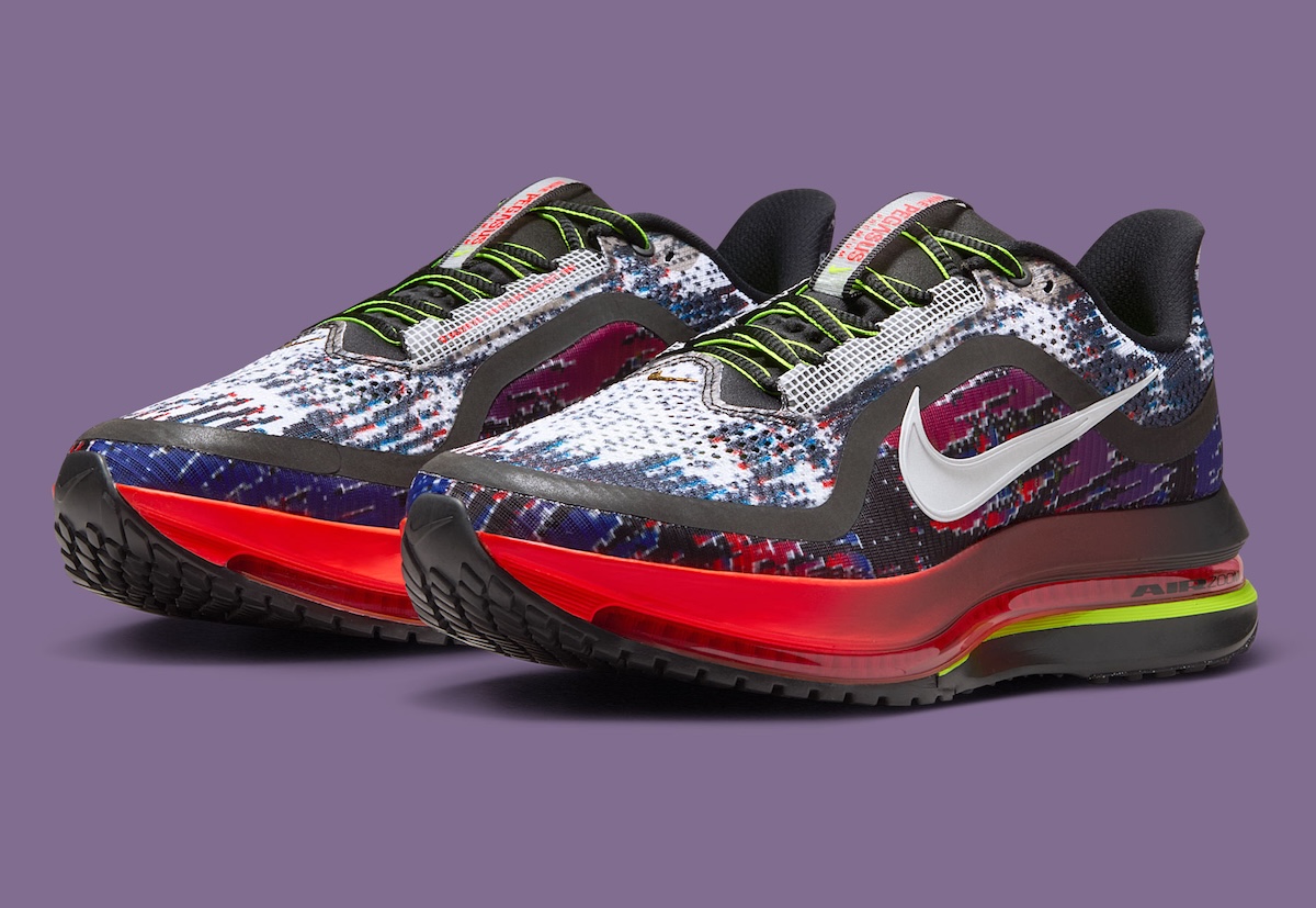 Boldly patterned, the upper features a blend of red, blue, purple, and white pixels reminiscent of static noise and scrambled screens. Bright neon green laces add a pop of color, cutting through the visual noise, and black overlays provide contrast and structure. The insole and tongue branding features the “Air Zoom” logos, enhancing the futuristic design.