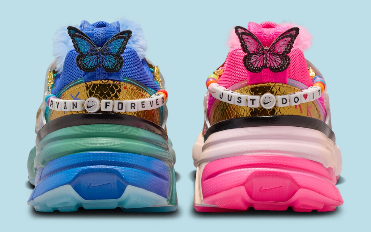 One shoe leans pink, the other blue, but both share that same bright, kid-made confidence. You notice the fur first. Then the clear Swooshes packed with sequins. The ribbons. The little gold touches tucked into random spots. It almost feels like flipping through her sketchbook.