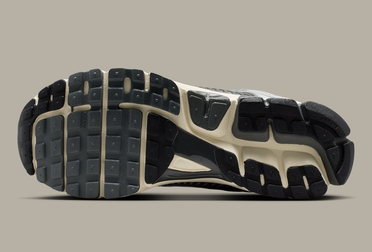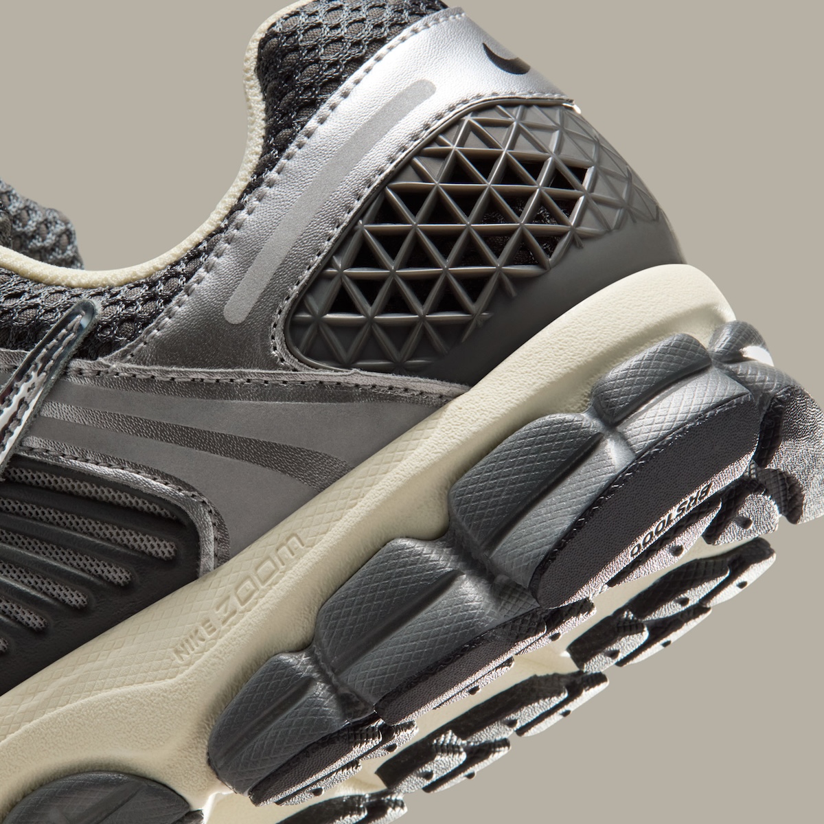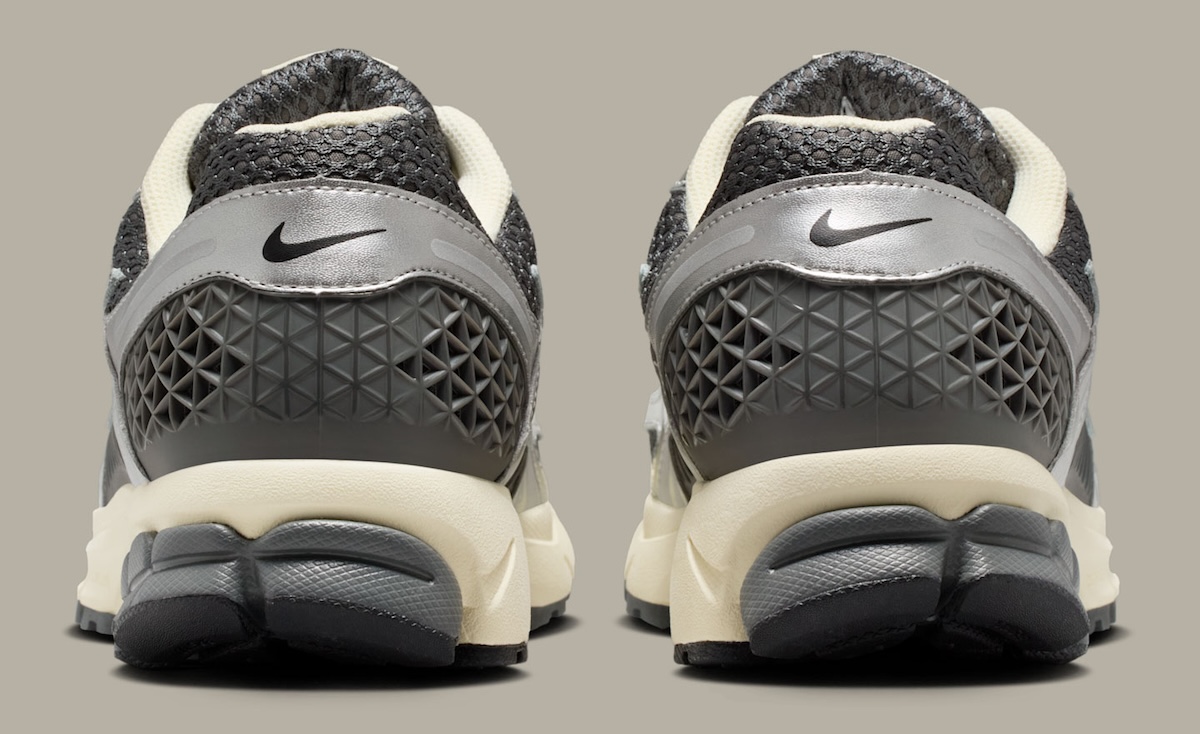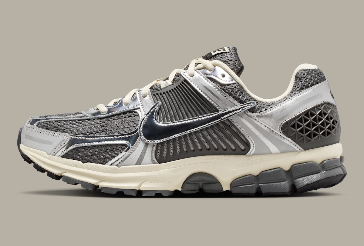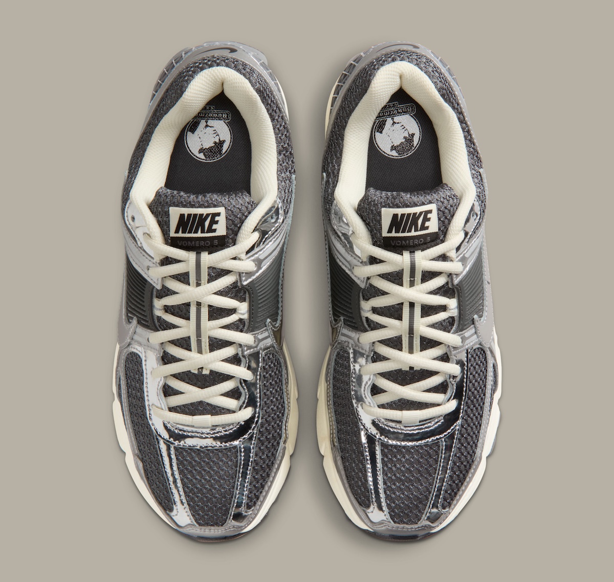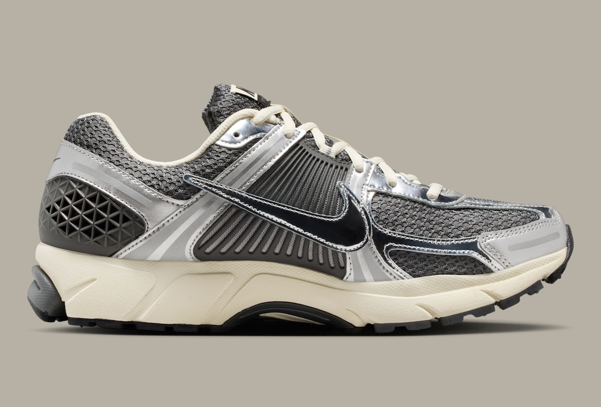 Chrome touches along the toe, midfoot and Swooshes to add just enough pop without turning the shoe flashy. Meanwhile, the charcoal TPU cage brings back that ribbed texture longtime fans instantly recognize. Nike softens the mood with sail laces and a matching midsole, which keeps the colorway from leaning too cold. The Cushlon and Zoom Air setup returns untouched, keeping the comfort that pushed the Vomero 5 back into everyday rotations.