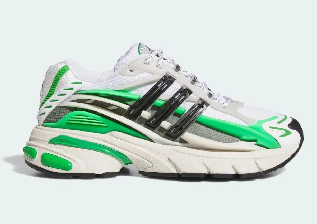 The silhouette takes inspiration from the early 2000s Adistar Cushion 3, but given a forward-thinking update. A pristine white mesh canvas acts as a blank canvas for rich green overlays, 3D cut midsole details and translucent black Three Stripes. Segmented exoskeleton-inspired overlays add structure to the design, while reflective accents are dotted throughout for a flash of visibility. Underfoot, the sneakers feature a combination of AdiPRENE+ cushioning and adidas’ Torsion System for optimal comfort and support, straddling modern performance and retro flair.