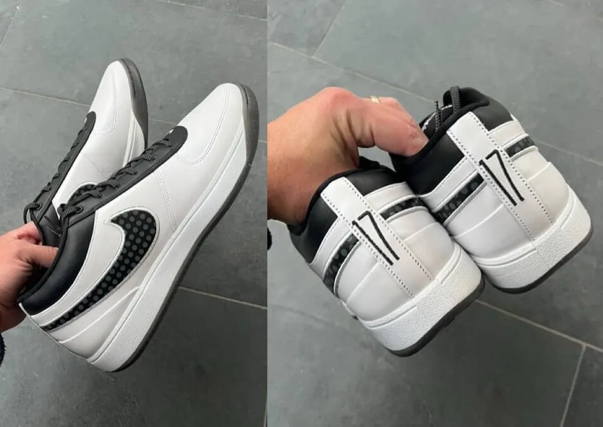 Made from high quality leather, the design is a simple white base with black overlays, all punctuated by a carbon fiber-inspired Swoosh that pays homage to Nike’s performance past. Black accents on the tongue, collar and outsole round out the streamlined, symmetrical look.