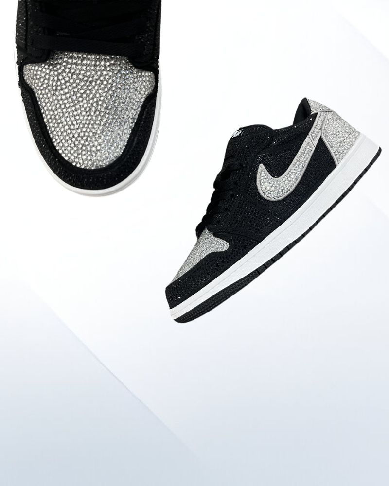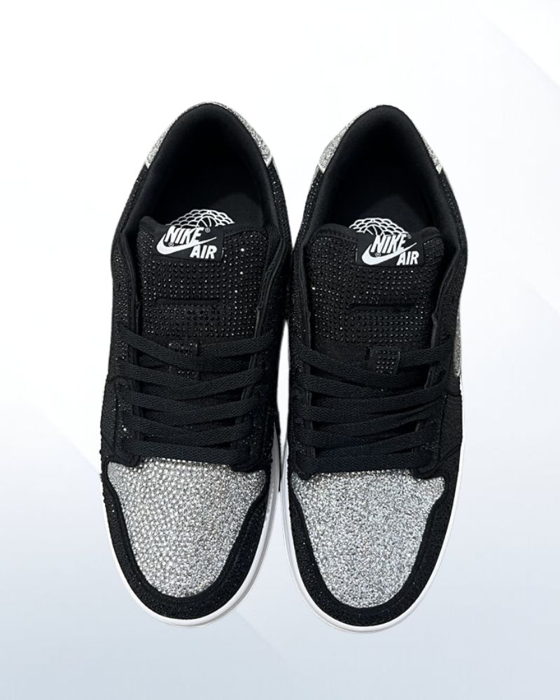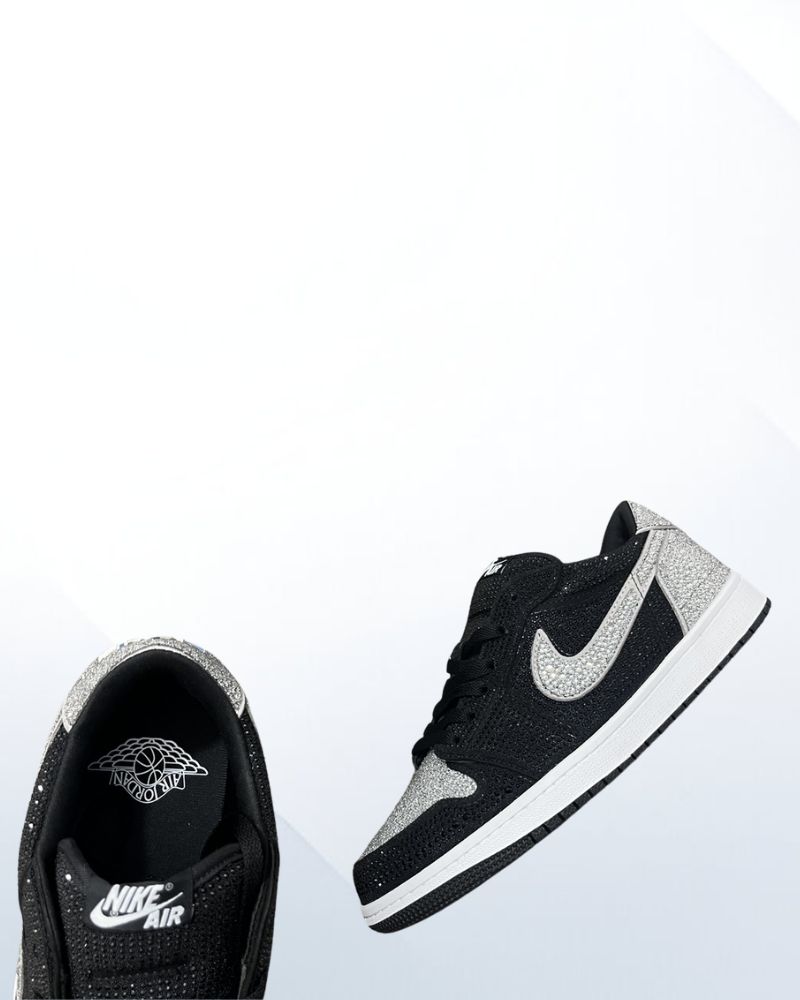 The Air Jordan 1 Retro Low Swarovski combines luxury detail and iconic design. A grey leather sneaker with crystal accents — where elegance meets streetwear.