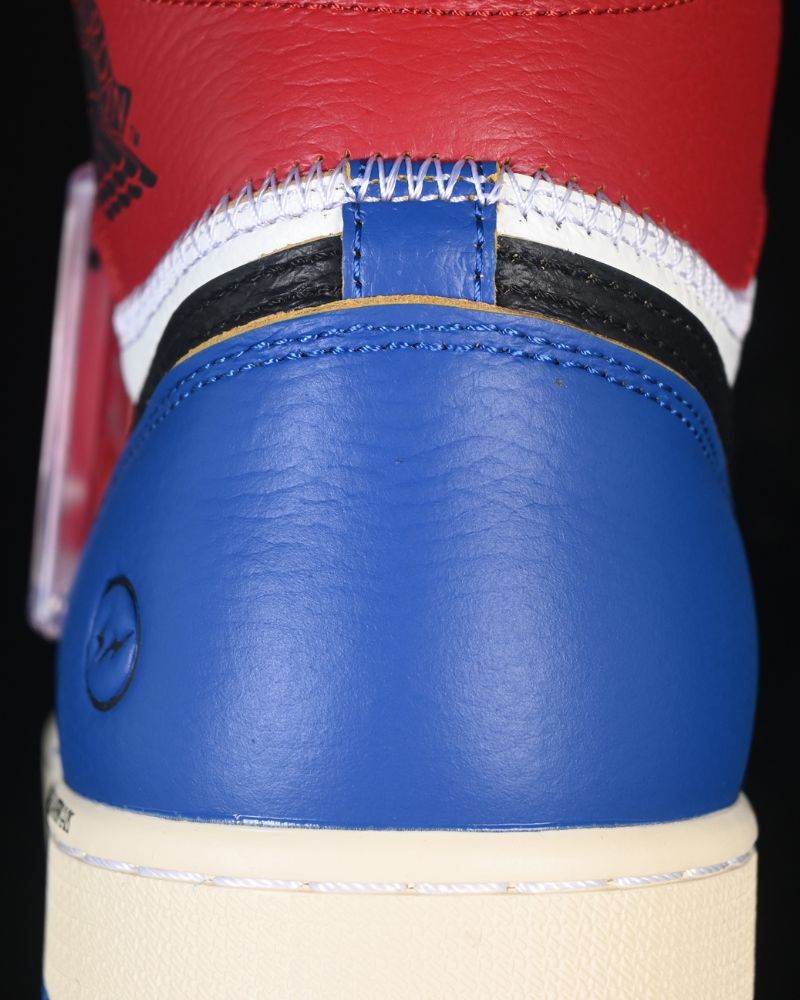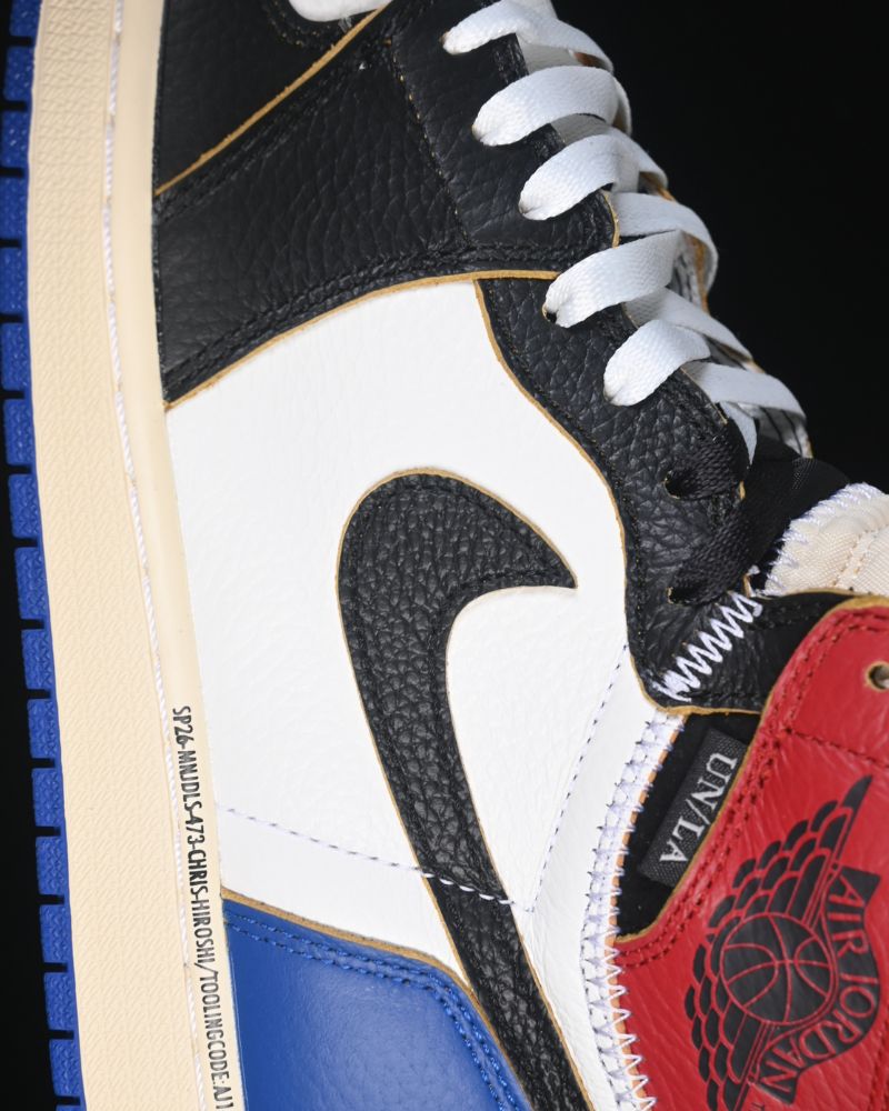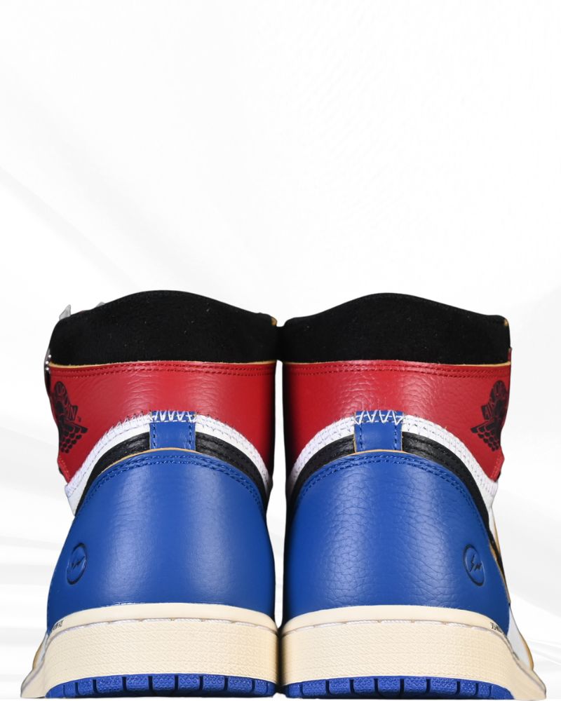 Fragment x Union x Air Jordan 1 High OG Top 3 is a premium concept sneaker merging three influential aesthetics: Union LA craftsmanship, Fragment Design detailing, and the legendary Top 3 Jordan color layout. This pair stands out with a mix of black toe structure, white leather panels, and contrasting Varsity Red and Sport Royal overlays.