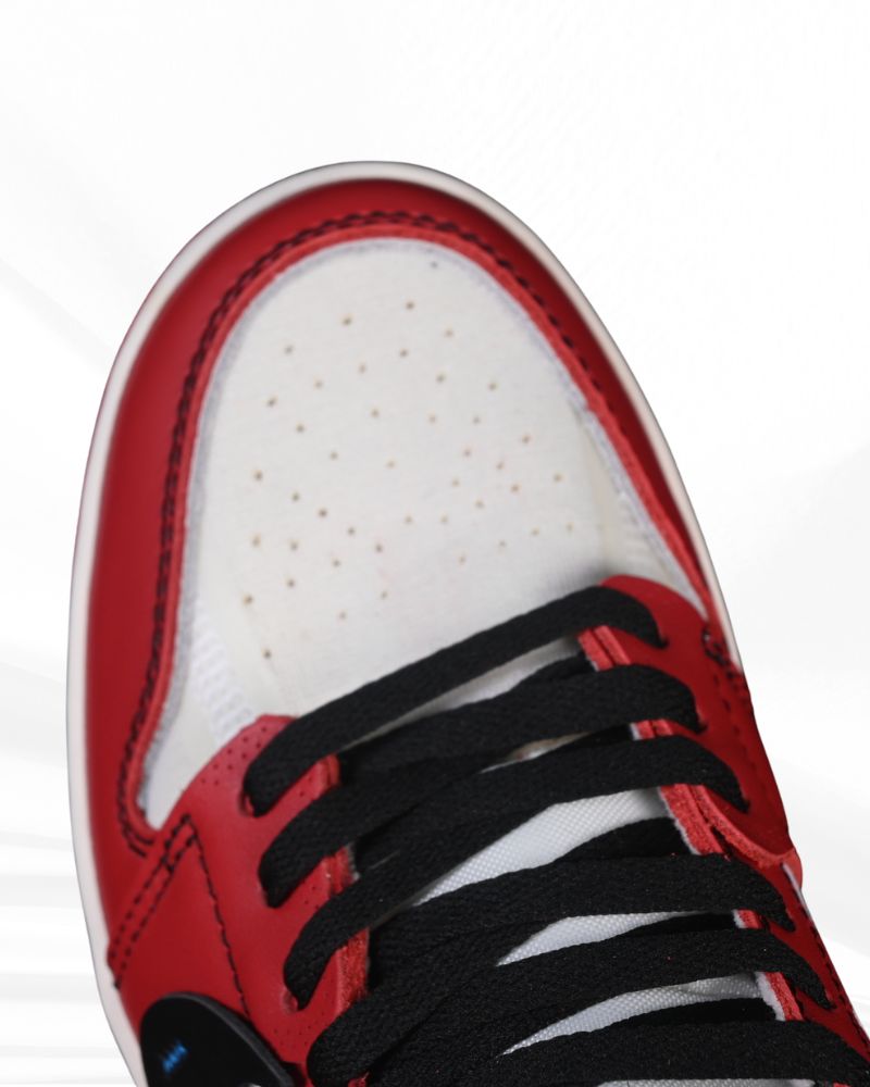 This sneaker features premium leather panels, deconstructed design elements, exposed foam, and the signature “AIR” text on the midsole. The red, white, and black Chicago colorway pays homage to the original 1985 silhouette while adding Off White’s unmistakable identity.
