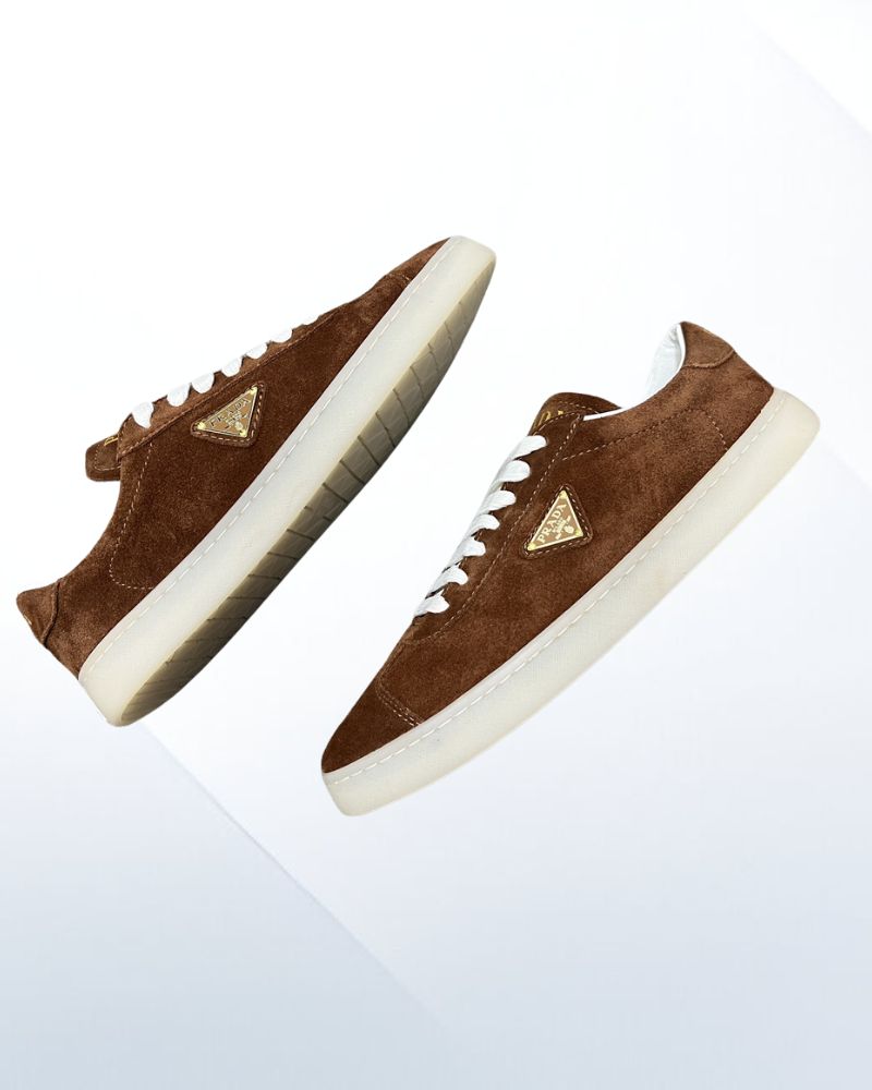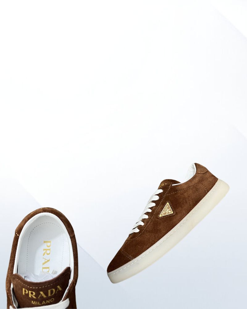 The Prada Lane Low Top Sneakers embody timeless Italian sophistication. Crafted from velvety tobacco-brown suede, they represent the perfect balance between luxury, comfort, and minimalism. Each pair showcases the signature Prada triangle logo on the side panel, a subtle nod to the brand’s refined identity.