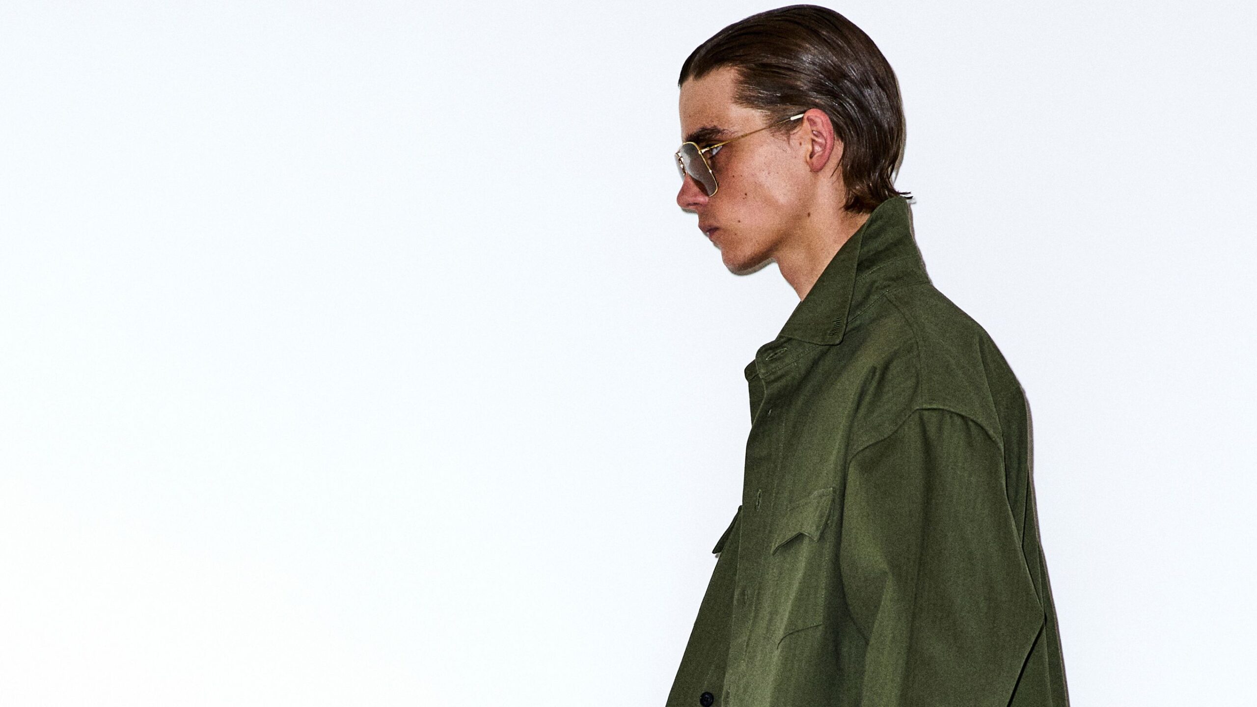 Military-workwear pieces are finely played at Rhude. Here they included a washed olive drill over shirt with house details on its flap pockets, paired with black cargo trousers, and a particularly excellent leopard print denim work-short. Leopard-print slipper shoes appeared under multiple looks, breaking up the largely neutral palette. Sunglasses included sporty wraparounds and gold-framed aviators. “I am the moodboard,” said Villaseñor. “The lifestyle is driven by me.”