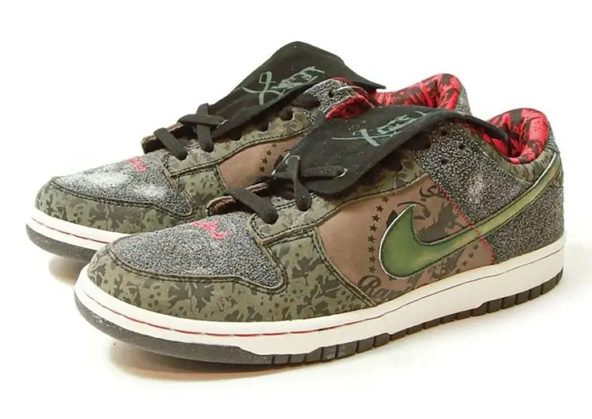 This pair, first launched in the golden era of SB Dunks, stood out with its military-inspired camo, distressed overlays, and signature lace flap hardware. The bold green Swoosh, custom tongue embroidery, and red interior graphics all carried SBTG’s signature hand-painted feel. For 2006, this was radical design work—details sneaker culture has since come to embrace widely. That’s why many still call this Dunk one of the most legendary collabs of its era.