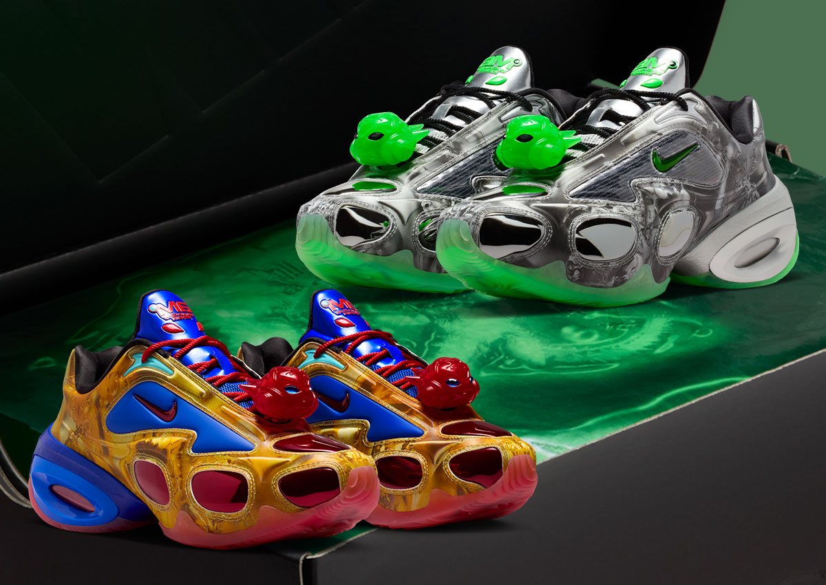 The the pairs drop in “Metallic Silver/Anthracite/Black/Rage Green” and “Metallic Gold/Clearwater/Racer Blue/Chile Red.” Both colorways boast a lenticular upper that appears to ripple and shift when viewed from different angles, evoking the kinetic frenzy of a night at the underground club.