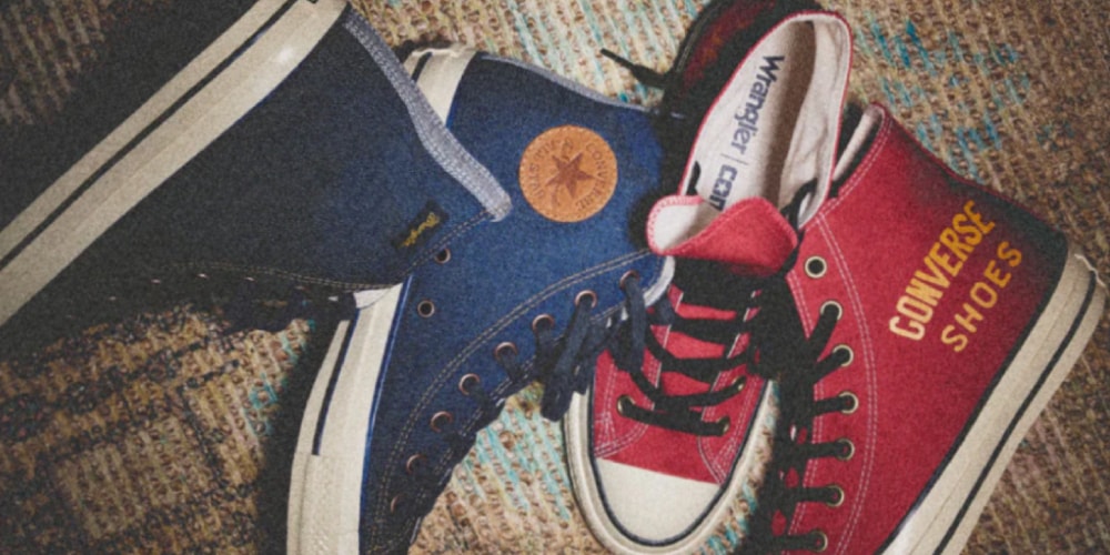 First up is the “Indigo” offering, crafted with Japanese Kaihara denim uppers inspired by Wrangler. The deep blue model is softly disrupted by a lighter tape line, exposed orange stitching, the circular medial Converse logo in brown leather and a Wrangler tag on the lateral. Meanwhile, its “Red” counterpart pays homage to the jackets given to rodeo tournament champions in the ’50s with “Wrangler Jeans” and “Converse Shoes” branding embroidered on the laterals of each shoe.